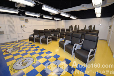 這艘人造航母最主要的組成部分是集會室,可召開高清視頻會議 —— 集合三層甲板及停機坪,共同協作重現任務的完成過程。通常,一套完整的音響系統由兩部分組成 —— 背景音頻和前臺音頻。背景音頻由多種音軌組成,這些音軌集合了設備里不同區域的全頻音箱和低頻音箱的聲音,包括引擎發出的持續不斷的轟鳴聲,偶爾出現的爆破聲,以及飛行器在航母短跑道起飛時發出的巨響。“所有的背景音頻音箱和超低音音箱必須隱藏起來”Ebbert說道,“每個人都認為背景音頻音箱絕對不能被學員看到。不過,我們還需保證音頻信號能夠平均覆蓋。”前臺音頻設備采用表面安裝的舷側音箱,用于時鐘、警鈴、廣播和尋呼。Crestron AV2總控十臺DN-F400數字音頻播放器和一臺Denon DN-F650R數字音頻錄音機。