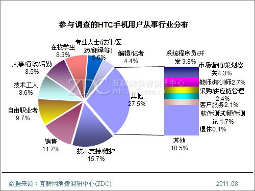 根據(jù)ZDC調(diào)查結(jié)果顯示,HTC手機(jī)用戶中從事技術(shù)支持/維護(hù)職業(yè)的用戶比例最大,為15.7%,與蘋果iPhone手機(jī)用戶職業(yè)以銷售為主的狀況不同。ZDC認(rèn)為這跟HTC手機(jī)注重技術(shù)、注重功能創(chuàng)新有直接關(guān)系。