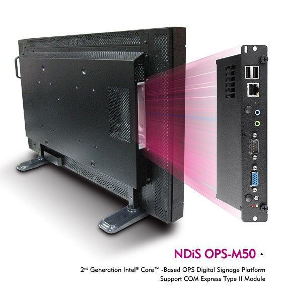 播放器NDiS OPS-M50 是基于2.50 GHz Intel® Core™ i5-2515E 雙核處理器,集成Intel圖形芯片3000, 遵循OPS. 播放器的尺寸是200mm 寬, 30mm 高, 119mm 深,是節省空間的插入顯示器的設計。播放器還支持更少的電纜,通過JAE 80-pin連接線支持DVI, UART, 和USB2.0 信號。 NDiS OPS-M50 可以簡化系統部署和降低安裝成本。還提供更簡便的維護和更新,播放器的更換無需拆卸整個系統。
