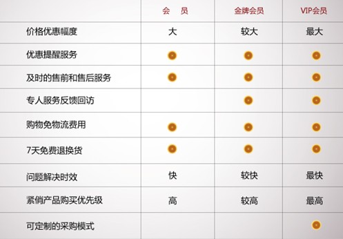 會員升級后不同會員會在價格優惠度、問題解決實效、緊俏產品購買優先級上有不同的待遇。尤其是VIP客戶是可以采用“定制式采購模式”,即可提出VIP客戶特需的設備,由聲視通電子商務平臺負責采購。