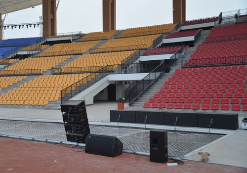 “銀基O秀” 觀眾席超過200米寬,可容納11000名觀眾。擴(kuò)聲使用D.A.S.定制的aero 12-DX無源防水線陣列模塊,LX-218C-DX防水超低音音箱和WR-6415-DX防水舞臺(tái)返聽音箱。aero 12-DX是高效能12英寸兩分頻線陣列模塊,共有8組(每組6只)采用地面堆棧安裝方式的線陣列覆蓋觀眾席。16只LX-218C-DX超低音音箱,分為6組,中間兩組每組為4只,另外4組每組2只,處理器為6臺(tái)DSP2060A。