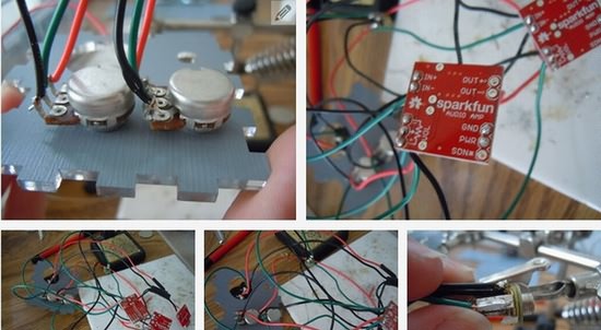 主要工具:usb插口,開關,電焊,一個3.5mm的迷你插口,線,8個尺寸適中的螺栓和螺母,兩個單聲道音頻放大器的板子以及電位器。
