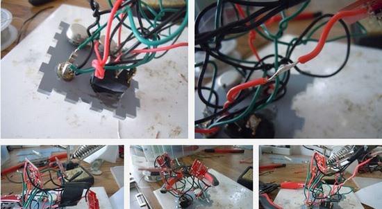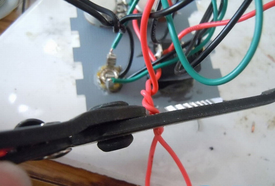 完成以后我發現還有一些沒用完的線,我決定盡可能多的利用完它們。把線前端的那一層膠膜用刀割掉,然后把里面的線絲呈螺旋狀擰在一起,用電工膠把它們包好,以防止短路。把剩余的線都重復以上步驟。
