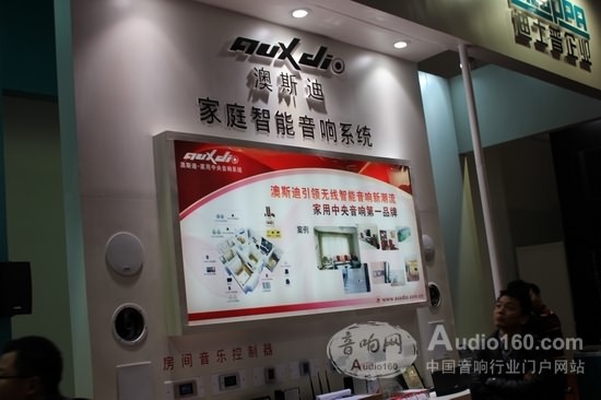 首次參展,澳斯迪的展位并不大,在36平米的展位上,Auxdio澳斯迪向廣大的參展客戶展示了多款家庭智能音響系統,包括:房間音量控制器、音視頻同步系統、數字化系統、智能MINI主機系統等。澳斯迪展位延續了以往的風格,中間墻面“澳斯迪引領無線智能音響新潮流,家用中央音響第一品牌”的標題十分醒目,另外還有智能家居解決方案和應用實例的圖片展會。其他部分以產品展示為主,各系列產品或擺放在桌面上或鑲嵌在墻面上,整齊規劃。