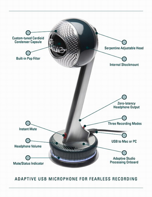 Nessie采用單獨(dú)定制的心型電容話筒頭。Nessie還有零延時(shí)耳機(jī)輸出,它可用于直接監(jiān)聽(tīng),主要作用是消除令人討厭的延時(shí)。而耳機(jī)音量與靜音控制都在話筒上。