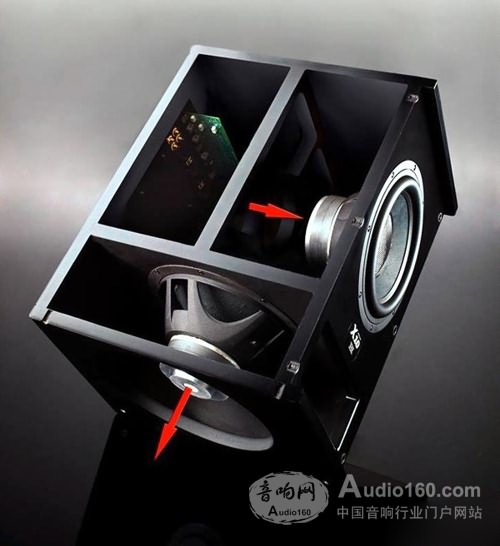 MK Sound超低音這兩支單體是以一正一反方式裝設(shè)的,并且位于底部的單體予以反相連接,因此兩支單體就會以相反的路徑動作。當(dāng)安裝于正面的單體向內(nèi)縮時,位于底部的單體也同時向內(nèi)動作,此時兩單體所處密閉音箱內(nèi)的空氣就受到強力壓縮,有如「空氣彈簧」般迅速將兩支單體「推回原位」(當(dāng)正面單體向外推的時候也一樣),如此一來MK這種雙單體推挽設(shè)計就可大幅降低單體振膜的非線性失真,讓超低音的發(fā)聲更為精準快速。