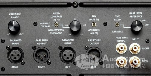 這是接線板上方輸出入端子及控制介面之特寫,X系列配備平衡及非平衡信號輸入各一組,也都有「旁通輸出」(Pass Thru Output)可供串接另一支超低音。三個旋鈕分別為相位、低通濾波頻率及音量控制,此外還有三個撥桿可快速切換到THX模式所需的低頻濾波、音量及低頻等化等設(shè)定,調(diào)整使用十分便利。