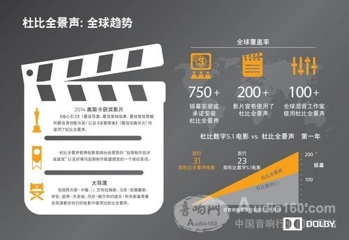 自2012年面世以來,杜比全景聲已被所有主流好萊塢電影公司、11名奧斯卡金像獎(jiǎng)獲獎(jiǎng)導(dǎo)演以及23名奧斯卡金像獎(jiǎng)獲獎(jiǎng)混音師所采納。超過250家電影放映商在40多個(gè)國家已經(jīng)或計(jì)劃部署超過750間杜比全景聲影廳,其中大中華地區(qū)銀幕數(shù)量已經(jīng)達(dá)到150塊。作為當(dāng)今全球最流行的基于聲音對(duì)象的音頻格式,杜比全景聲得到了所有業(yè)界領(lǐng)先的服務(wù)器供應(yīng)商的支持。此外,40多家DCP母版制作機(jī)構(gòu)和100家混音棚已具備杜比全景聲電影制作能力。