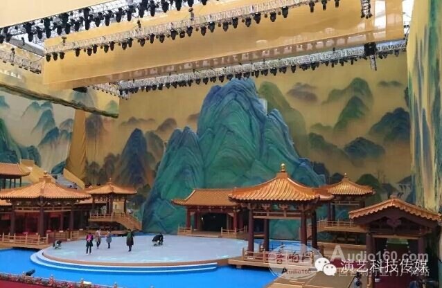 演出場館設置在水立方跳水池,為了這次歡迎晚宴的舉行,跳水池經過徹底改裝,將原先的觀眾席用巨幅舞臺紗幕全部遮擋起來,并將伴宴的樂隊巧妙地隱藏在紗幕后面,配合燈光的使用,實現了若隱若現的效果。同時,搭配兼具功能性和美觀性的門樓,營造了和諧的就餐氛圍。據了解,紗幕的繪景由中唐云錦文化(背景)有限公司負責,現場使用的紗幕共8幅,總面積達1萬多平方米,并且紗幕上面的具有濃厚國畫風格的《萬里江山圖》全部是純手工繪制,屬于國內繪景規模最大的一次。而現場裝飾部分的制作、安裝和調試則由杭州佳合舞臺設備有限公司負責。