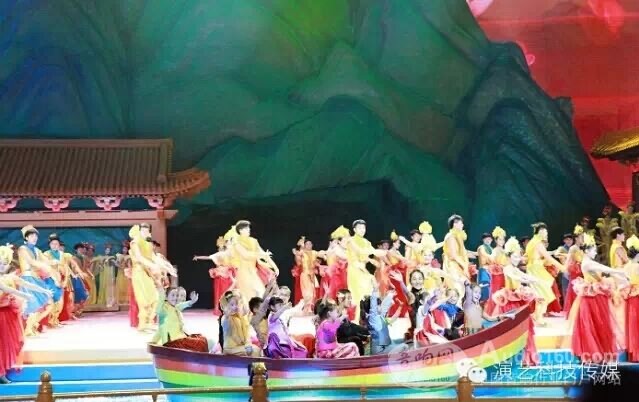 文藝演出的主舞臺包含了直徑為18米的中心圓形舞臺、用來遮擋跳水臺的玻璃鋼假山、5個可移動的亭臺樓閣、長廊、位于第二層的亭臺表演區、舞臺背景大屏幕、兩側的投影幕以及舞臺吊桿等,舞臺的整體設計具有層次感,并通過舞臺機械將有限的空間有效地利用起來,在視覺上體現了大國風范。