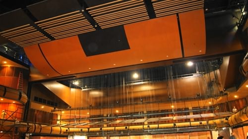 作為設備供應商之一,威戈公司制作了一個6000磅重的波形吸音吊頂用來塑造音響效果。這個吊頂組件安裝在幕前舞臺的正上方,深17英尺,長48英尺,結構內部還配有一組主揚聲器。
