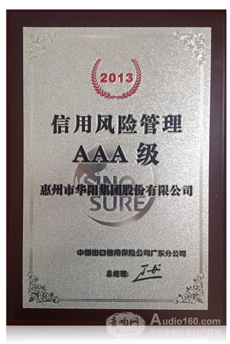 2014年4月,惠州市華陽集團股份有限公司獲評“2013年度信用風險管理AAA級稱號”。該榮譽由中國出口信用保險公司廣東分公司(以下簡稱“中國信保”)評級并頒發證書。據悉,廣東省內共223家出口企業分別獲得中國信保頒發的“AAA”“AA”“A”的信用風險管理企業稱號,其中AAA級企業僅23家。