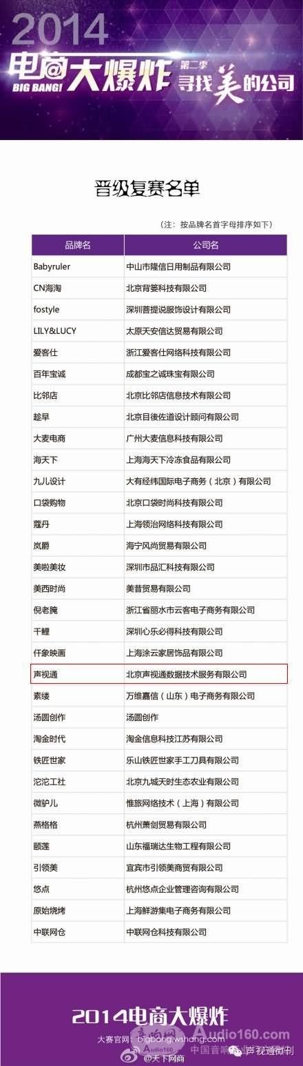 在初賽現場,由資深媒體人、專業自媒體人、TOP電商創業者、著名投資人、EMBA企業導師等20位成員組成評委團,對進入初賽的100家公司,從產品/服務、團隊、商業模式、未來規劃等維度綜合評定。入圍60強的企業在專題頁面及手機端進行“為美的公司點贊”人氣大考驗,聲視通憑借自身雄厚的競爭實力,組委會最終通過網友投票和專家評委評委進行綜合評定,確定聲視通入圍電商大爆炸“美的公司”32強,挺進復賽!