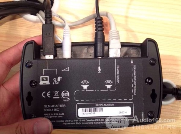 這就是新SAM系列的控制中心——GLM 網絡適配盒。它采用了與真力M系列箱體一樣的NCE天然合成材料制成外殼,底部的圖示說明簡單實用,一個USB接口用來連接電腦和供電,兩個小三芯接口一個用來連接測試話筒,一個用來外接音量控制旋鈕,RJ45網口口用于串接音箱組成GLM網絡。