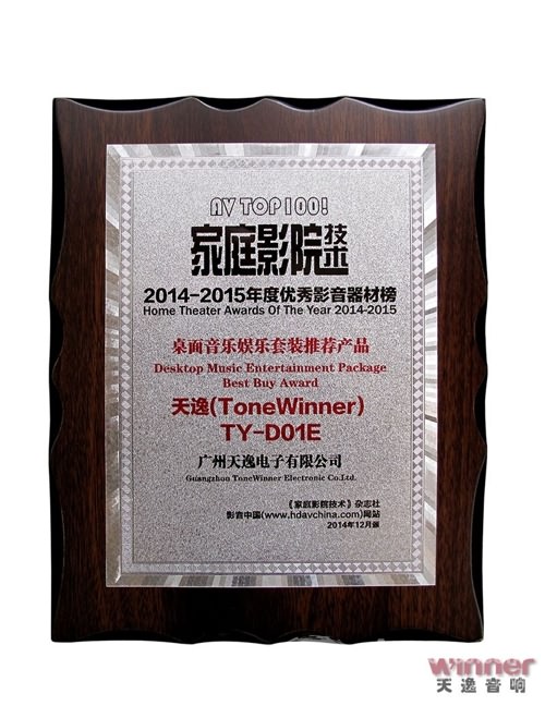 天逸電子分音多媒體音響TY-D01E參與國內著名音響傳媒《家庭影院技術》組織的2014-2015年度優秀音影器材現場測試、現場試聽,在眾多多媒體音箱器材中脫穎而出,得到了專家和眾多發燒友的一致認可和贊譽,認為其表現非常HI-FI,音質音色達到或超越同價位的高保真HI-FI器材,順利入選2014-2015年度優秀音影器材榜:“桌面音樂娛樂套裝推薦產品”。