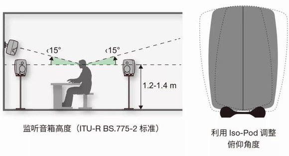 對(duì)于典型的二分頻監(jiān)聽音箱,音箱聲軸高度應(yīng)與耳朵平齊,通常距地面 1.2 至 1.4 米。將音箱置于更高的位置,并稍向下傾斜,可以減少地面反射的影響。對(duì)于標(biāo)準(zhǔn)的立體聲和多聲道重放,請(qǐng)勿將音箱置于過高的位置上,聲軸俯角應(yīng)小于 15°。音箱需要始終指向聽音點(diǎn)。音箱設(shè)置的越高,地板反射對(duì)于頻率響應(yīng)的影響越小。但需要注意,天花板也會(huì)造成低頻反射,請(qǐng)勿將音箱置于超過層高一半的高度。