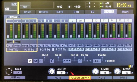 此設置的優點:當改變輸入通道的聲像時,主輸出LR會跟著改變聲像,輸入通道發送給Link 之后母線Bus的聲像不會跟著改變,需要手動去調節Pan。選擇輸入通道,在HOME頁的子選項的SENDS頁下方選擇了FOLLOW LR PAN功能,那么輸入通道發送給Link 之后母線Bus的聲像會跟著發送給LR的聲像同步。