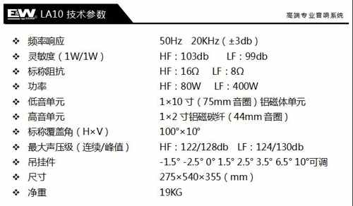 LA-10有源線陣采用吊掛方式,經專業工程師安裝調試,線陣音響能夠提供非常良好的垂直覆蓋面的指向性,取得良好的聲效果。高音使用了低失真鈦復合膜高音壓縮單元,特別設計的高拱形球頂結構,大大增加了振膜的強度,降低了諧波失真。緊奏型箱體,高保真/高清晰度,可以直立,橫放,或者堆疊在每個音箱之上,或者并列擺放。