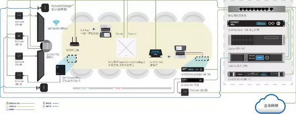 綜合會議系統解決方案采用QSC Core數字音頻處理器作為核心管理系統, QSC CX-Q網絡數字功放、QSC AD-S系列壁掛揚聲器以及森海塞爾TeamConnect Ceiling 2天花式吊頂陣列麥克風、Visionary Solutions分布式網絡視頻設備、Kramer無線協助系統構建一整套多功能綜合會議解決方案。