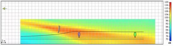 如上面Ease預測圖所示,僅使用8只音柱,聲音在觀眾區域有較為均勻的覆蓋,在距離舞臺大約50米的綠色聽音點位置,仍能保持大約105dB的聲壓。