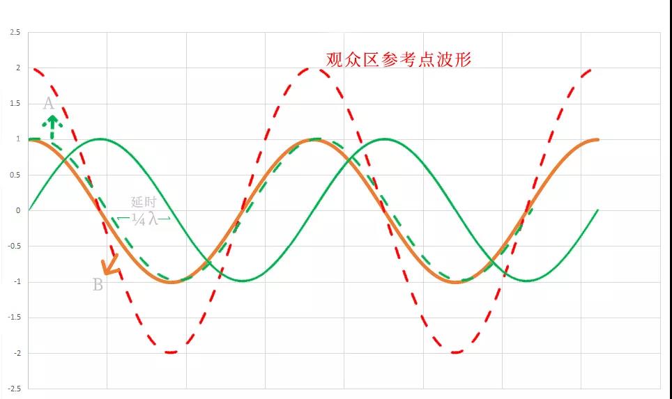 通過(guò)上圖可以看到,通過(guò)改變時(shí)間,對(duì)于舞臺(tái)區(qū)和觀眾區(qū)的影響是不一樣的。當(dāng)對(duì)A做延時(shí)的時(shí)候,我們得到了最想要的情況,即觀眾區(qū)聲波疊加,舞臺(tái)區(qū)聲波減少。而B(niǎo)情況剛好相反。那么在對(duì)A做延時(shí)之后,問(wèn)題真的都解決了嘛?實(shí)際上不是的,由于我們討論的是單頻率正弦波的情況。在對(duì)A做延時(shí)之后,我們只是對(duì)某一頻段在舞臺(tái)區(qū)域起到了抵消的作用。而對(duì)于其他低于該頻率的正弦波是不起作用的。所以對(duì)于舞臺(tái)區(qū)域的衰減是不完全的。但對(duì)于觀眾區(qū)的疊加卻是完全的。