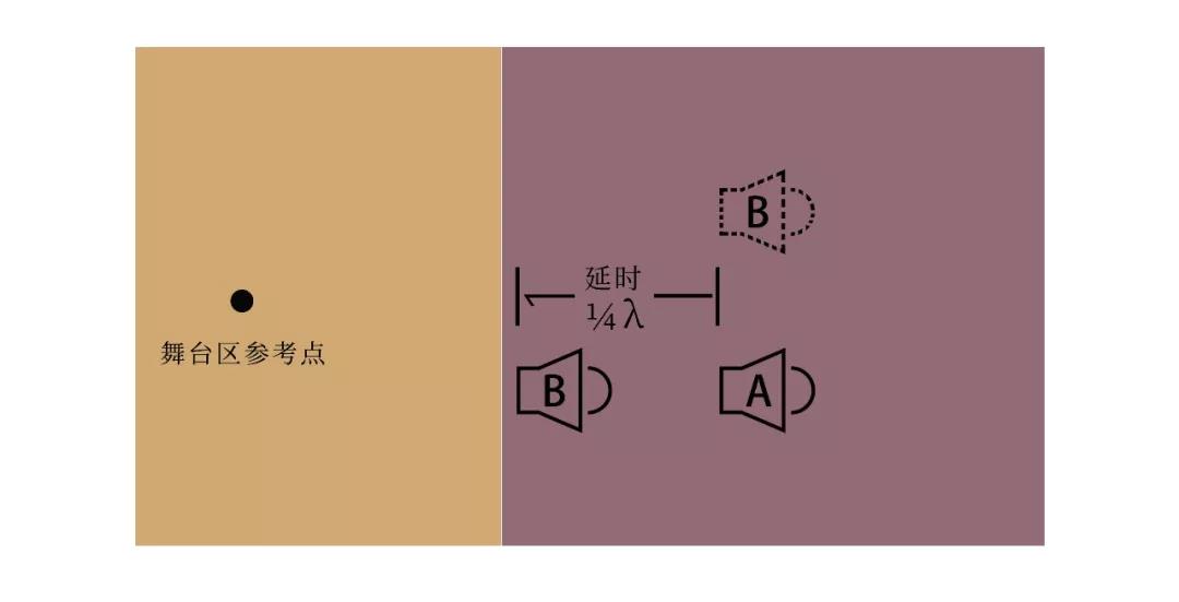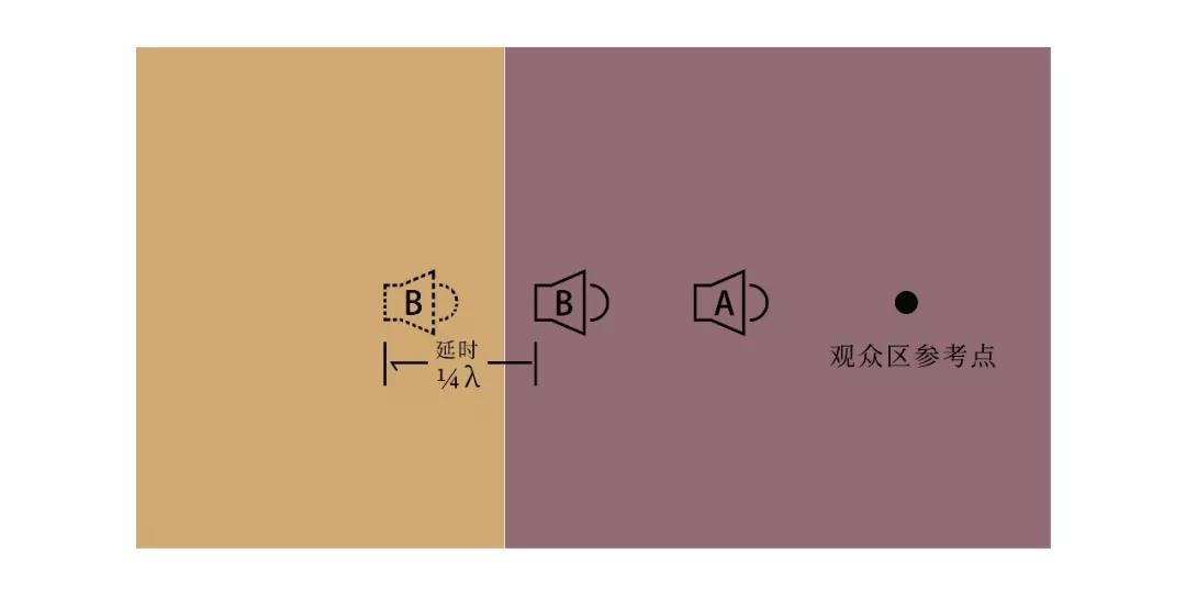 我們就得到了一個(gè)想要的結(jié)果,即舞臺(tái)區(qū)抵消,觀眾區(qū)疊加。那這次我們是否可以對(duì)其他頻段起到同樣的作用呢?我們從圖上可以看出,對(duì)于舞臺(tái)區(qū)域來(lái)說(shuō),經(jīng)過(guò)延時(shí)的B音箱,在空間當(dāng)中的虛擬位置已經(jīng)和A音箱完全重疊,且完全反相,所以任何的頻率的聲音從理論上來(lái)說(shuō),都應(yīng)該是完全抵消的。這樣一來(lái)我們就解決了舞臺(tái)區(qū)串音及回授的問(wèn)題。