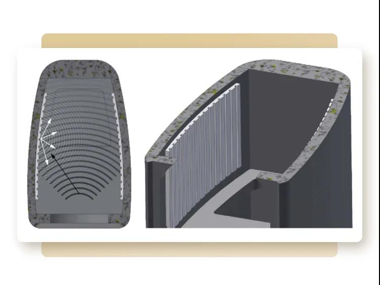 兼具箱體結(jié)構(gòu)加強(qiáng)以及聲學(xué)功能的Kerf Cut。條形切割板與箱體緊密結(jié)合,增強(qiáng)箱體穩(wěn)定性。