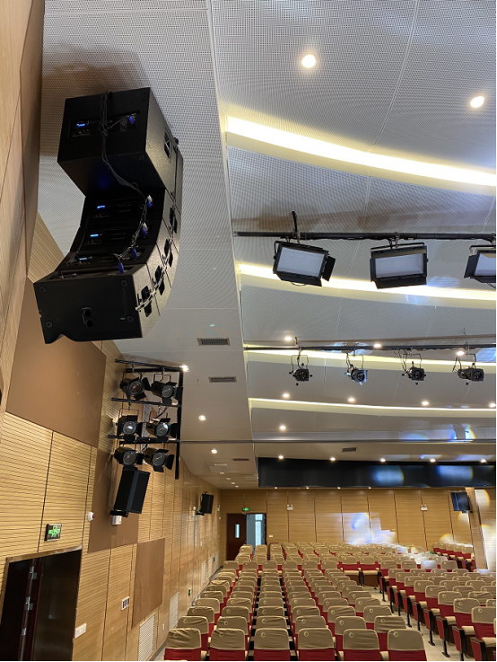 舞臺左右每側各4只Turbosound(特寶聲)TBV123-AN和1只TBV118L-AN智能有源線陣列揚聲器組成陣列系統,通過國際權威的EASE Focus聲學模擬軟件精確計算聲場覆蓋和最佳吊掛點選擇,為多功能廳提供了最優的擴聲覆蓋。