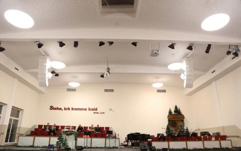 在這個舞臺上經(jīng)常有樂隊演出,所以教堂需要一個擴(kuò)聲系統(tǒng),他要能提供高質(zhì)量的聲音輸出,準(zhǔn)確又悅耳,而不會有其他噪聲。來自Ton & Technik公司的馬蒂亞斯謝夫先生解析道:“系統(tǒng)需要處理樂隊演奏音樂,同時也要適應(yīng)古典合唱團(tuán)和管弦樂隊。因此,他必須提供良好的覆蓋范圍和完美的語言清晰度服務(wù)。”