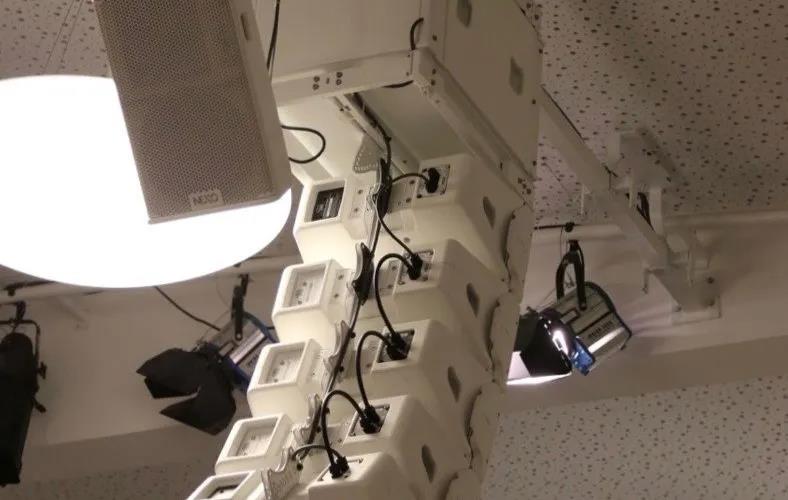 全白色主擴(kuò)聲陣列左右各4只GEO M1012+1只GEO M1025,線陣上方1只MSUB15超低頻音箱。NEXO超緊湊ID24音箱用在舞臺前補(bǔ)聲。吊掛的白色PS10音箱,左中右三個,為唱詩班提供監(jiān)聽。舞臺監(jiān)聽使用一對PS8。