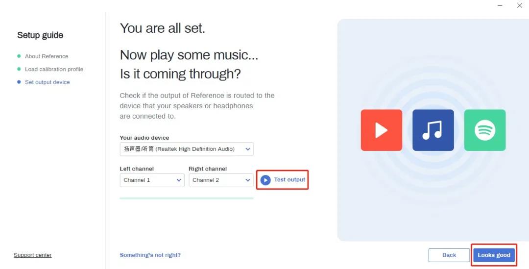 ★ 在之后的輸出設置頁面中的Your audio device下選擇音頻接口,并在Left channel 和 Right Channel 選擇進行監聽的左右輸出通道,可以通過點擊Test output圖標測試通道匹配是否設置正確,完成設置后可點擊Looks good圖標