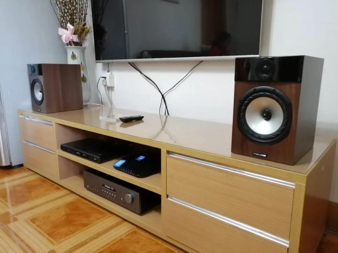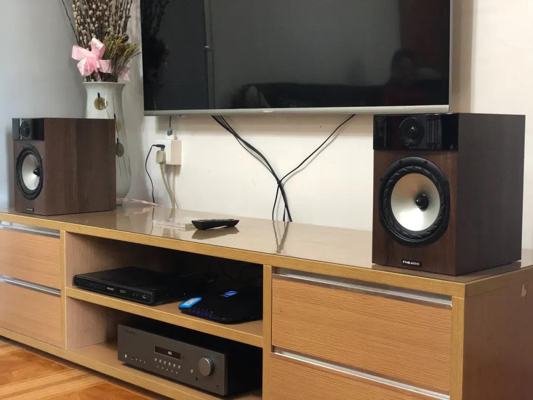 發燒友采用了英國劍橋功放 AXR100 搭配 Fyne Audio 書架 F301 胡桃木系列.