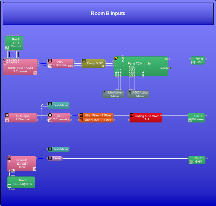 此系統(tǒng)設(shè)計(jì)模板的示例文件設(shè)置了所需的所有音頻 I/O、處理和控制點(diǎn),并已準(zhǔn)備就緒可加載到系統(tǒng)并開(kāi)始設(shè)置房間增益結(jié)構(gòu)和 EQ。文件中配備了支持房間設(shè)計(jì)要求的矩陣路由。