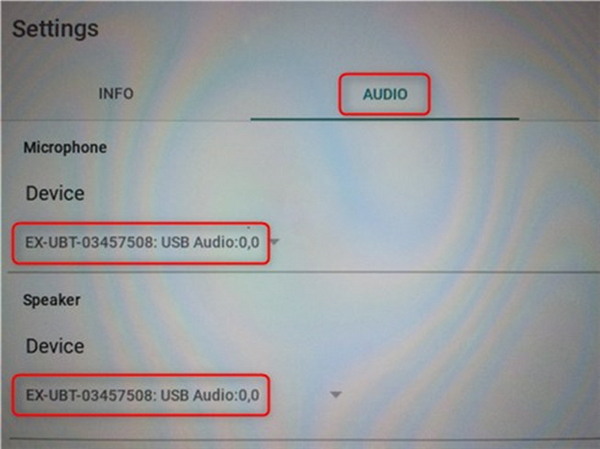 進(jìn)入 Audio(音頻)菜單,然后在 Microphone(話(huà)筒)和 Speaker(揚(yáng)聲器)下拉菜單中選擇 EX-UBT。