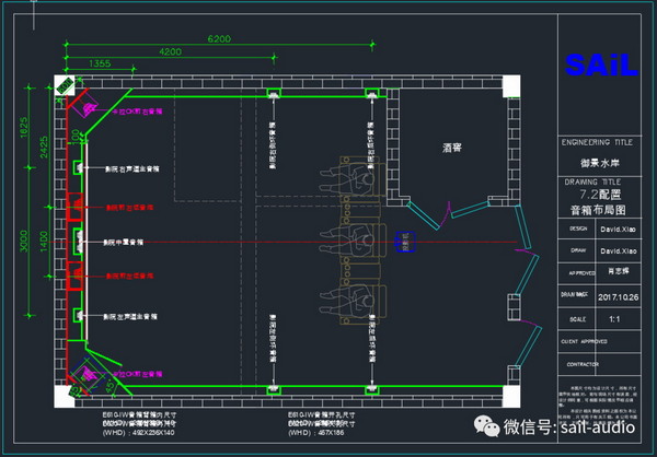 后墻:基于后墻不規則空間,后環繞同樣嵌入左右酒柜中。保持音箱到觀影距離一致,達到合理的布局。