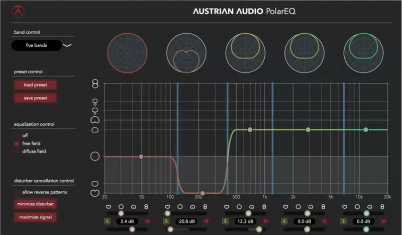 使用OC818麥克風雙通道錄音工作之后,你完全可以在后期制作使用PolarDesigner進行指向性調整。你可以在5個不同的頻段內,在全指向到8指向等多個設定中自由的切換。