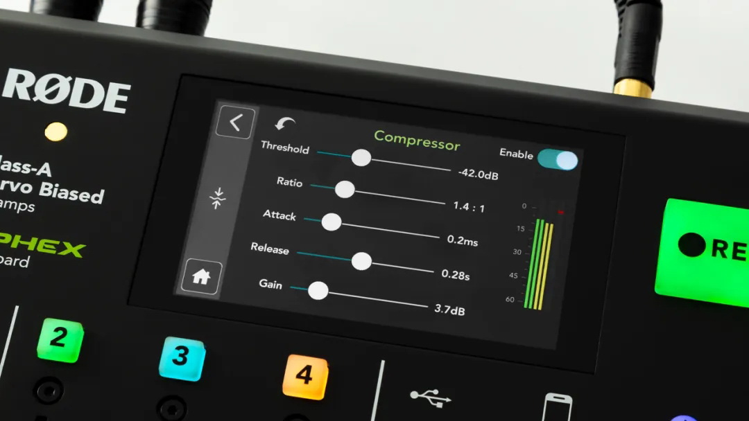 你不僅可以通過 RØDECaster Pro 的觸摸屏界面找到所有高級可調功能,還可以通過 RØDECaster Pro 配套的 APP 在電腦上進行所有編輯。只需將 RØDECaster Pro 連入電腦,開機并打開 APP。然后轉到 “文件(File)” > “打開音效編輯器(Open Effects Editor)”。從這里你可以實時調整所有處理器。通道和主控的壓縮器中還有一個處理圖,因此你可以輕松的判斷壓縮設置如何影響音頻,及時調整輸入并確認壓縮量數值。
