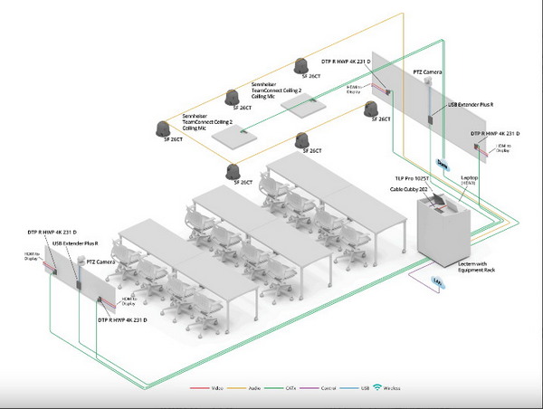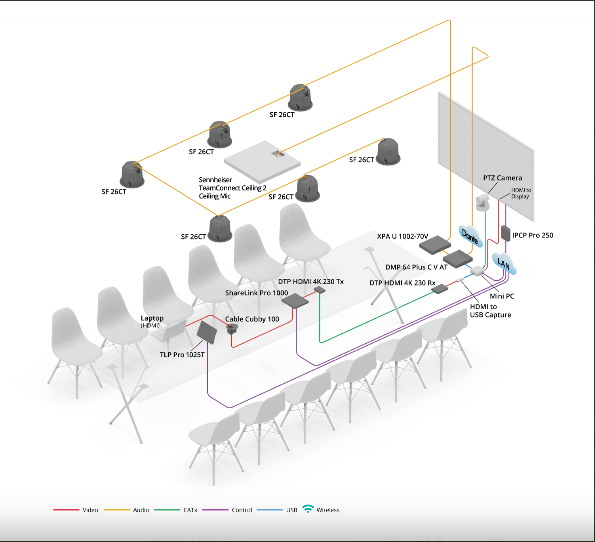 會議室為會議和協作提供更為正式的場所。它們的空間比常規會議室要大,能容納 12 個人或者更多,其設施通常可支持多功能會議集合。該系統支持 1 路桌面 HDMI 和 1 路與 ShareLink Pro 1000 連接的 BYOD 無線信號源。它包括 TLP Pro 1025T 設備控制以及用于電纜和 AC 電源管理的 Cable Cubby 100。CATx 電纜可用于房間內的信號傳輸。該尺寸的房間需要一款音頻系統以用于擴聲,而且 SF 26 CT 天花板揚聲器也可以在整個聆聽區域保持一致的聲壓級。Sennheiser TeamConnect 2 天花板麥克風可將人們在房間任意位置講話的聲音放大,并經 Dante 將音頻輸出至視音頻系統。