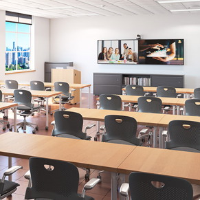 此大型培訓室最多可容納 40 人,支持基于 PC 的會議功能,即使遠端團隊成員也能夠參加培訓或大型會議。房間集成了眾多先進的控制功能,分別用于協作、演示和視頻電話會議。該系統支持講臺 1 路 HDMI 信號源連接。它包括房間前后各兩個顯示器、觸摸屏控制、用于會議的永久性 PC 以及電纜和 AC 電源管理功能。該尺寸的房間需要一款帶全音域天花板揚聲器的音頻系統以用于擴聲,以及兩個 Sennheiser TeamConnect 2 麥克風陣列。