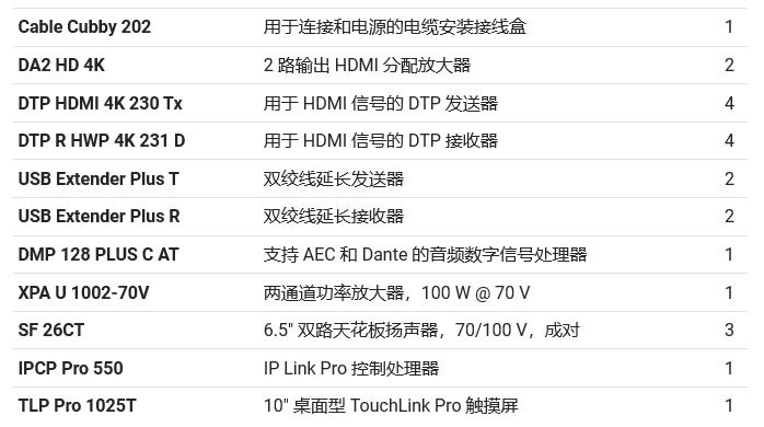 ·Extron DMP 128 PLUS DSP 處理器和 Extron XPA U 1002-70V 功率放大器提供音頻處理、AEC 和音頻放大