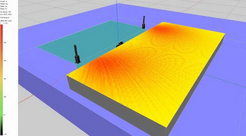 Syva峰值聲壓級高達142dB,覆蓋范圍廣至140°。通過周鳳歆老師前期對場地進行Soundvision軟件測試顯示,Syva的聲壓級足以達到搖滾音樂會現場的要求,徹底打破了吳老師前期的擔憂。