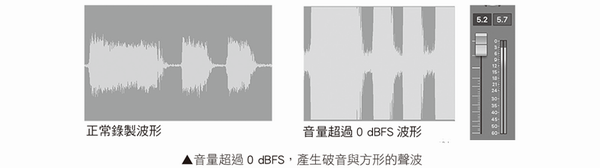 由于歌曲的聲音透過機器裝置錄下,并透過裝置播放,因此錄音與播放的聲音都有極限,最大值極限即為0 dBFS,若音量到達0 dBFS時就會產(chǎn)生破音(Overdrive 或Distortion),更大的音量將無法被記錄,使聲波呈現(xiàn)如下圖中的方形,因此在母帶后期處理時,才會在最后加上限制器,以防聲音超過極限值。