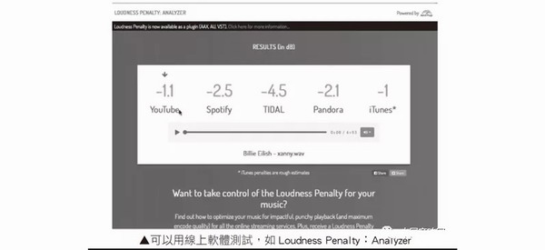 若是歌曲輸出后仍擔心音量會超過限制,可以嘗試將音檔上傳到LUFS 測試的網(wǎng)站,由軟件判讀音樂上傳到Spotify、iTunes、YouTube時,音量是否會被調(diào)整多少,以檢測自己的音樂是否達到標準規(guī)范。