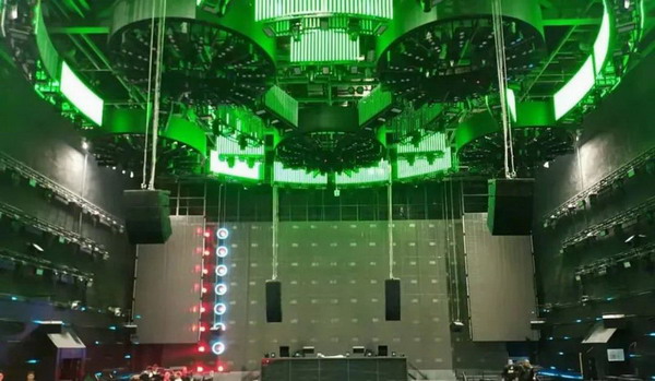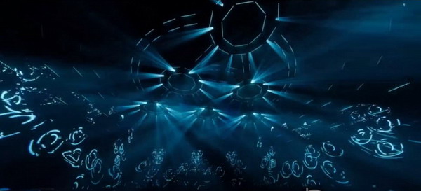 15米的層高讓它有更多可發揮的空間。先是四周4層弧形燈架呈圓形層層錯落,盤踞在場地上空。其上遍布的數百只燈具根據場景或變幻色彩或轉動角度。燈架下的四周則是一圈屏幕,包括巨大的舞臺主屏幕;配合VJ設計讓場景更具包裹感。