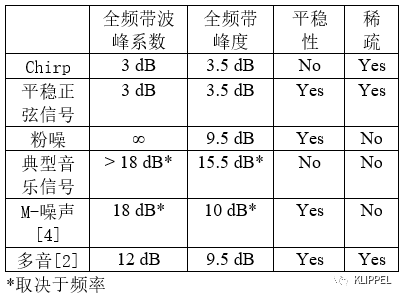 如IEC 60268-21[2]所定義,多音激勵信號包括三個或更多音調,每個音調具有唯一且固定的頻率。如表1所示,多音信號的波峰系數比正弦波激勵大得多。為了比較信號,可以使用波峰系數或峰度,而峰度是描述任意給定數據點非常接近均值對比非常遠離均值的概率的度量值。此兩種情況下,較高的值都表示信號能量更集中在平均值附近,而不是峰值處。但是,峰度比波峰系數更可取,因為峰度可以告訴信息的相似性,且統計特征更可靠。表1對此進行了說明,其中粉噪的波峰系數理論上可以是無限的,但在實際系統中,總是有一個上限。但是,實際系統的波峰系數并不可靠,因為它取決于所分析信號的峰值,該峰值可能隨時間變化,并且可能隨捕獲信號的長度而變化。當比較峰度值和平穩度時,多音激勵與粉噪非常相似。