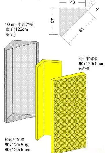 所以,要降低低頻駐波的困擾,最實(shí)際的方法還是:“吸收”。通?梢允褂谩暗皖l陷阱”作為吸收低頻駐波的手段。吸收的原理就是:當(dāng)?shù)鸵敉ㄟ^(guò)吸聲材料或結(jié)構(gòu)時(shí),使材料內(nèi)部振動(dòng),讓聲能轉(zhuǎn)化成為機(jī)械能和熱能的過(guò)程。低頻駐波通常會(huì)在四個(gè)墻角聚焦最嚴(yán)重,低頻陷阱也就是放在墻角效果最好。