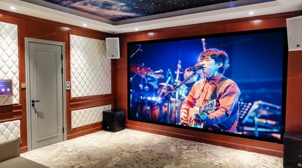 為了豐富家庭娛樂使用,業主希望影音室實現完美觀影功能的同時,兼顧K歌娛樂功能。因此,我們增加設計了一套4.2專業娛樂系統,選用意大利B&C定制版K12作為前置音箱,K10作為后置音箱,同時配合KW15超重低音炮使用,讓業主在家也能享受到專業娛樂空間的K歌效果體驗。