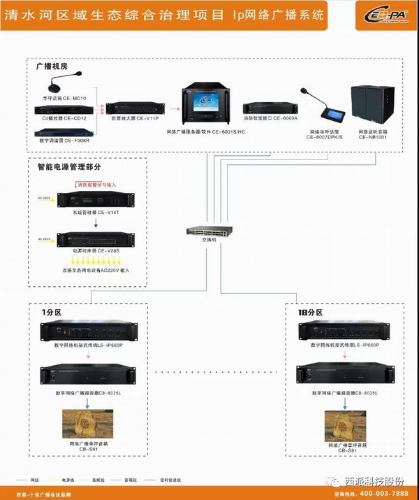 公司擁有CEOPA系列廣播系統(CE系列廣播系統、DCI數字系列廣播系統、NCX網絡音頻系列廣播系統、多音源系列廣播系統及數字集控式系列廣播系統)被廣泛應用于公園、廣場、智能小區、智能建筑、酒店、工廠、學校、銀行等場所,CEOPA IP網絡廣播系統是擁有自主知識產權的廣播系統,它是利用計算機以太網(局域網/廣域網)傳遞數字音頻信號的系統;完善,穩定,便捷,CD音質,任意分區組合,互動點播,定時定點播放,音源無限,雙向對講,,智能開關機,網絡報警;有網絡的地方隨意添加,隨心所欲,覆蓋以往各類廣播之所有功能。適合各類大小廣播工程,全面解決方案,深受國內外客戶信賴。