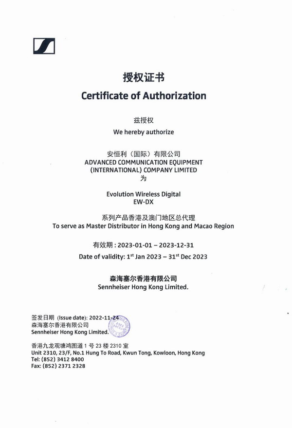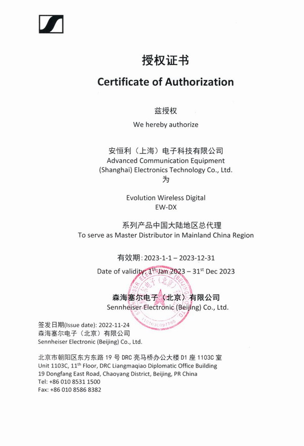 2022年11月,安恒利(國(guó)際)有限公司與森海塞爾香港有限公司戰(zhàn)略合作簽約,正式成為森海塞爾EW-DX數(shù)字無(wú)線系統(tǒng)在中國(guó)大陸及港澳地區(qū)的授權(quán)總代理商。