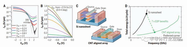 在單個(gè)器件水平上,最近的研究表明顯示了短?hào)艠O長度(10nm)、對(duì)于單CNT晶體管具有接近理想亞閾值擺幅的互補(bǔ)p溝道和n溝道器件,以及對(duì)于具有每微米50個(gè)CNT的密度的對(duì)準(zhǔn)CNT具有每寬度的高導(dǎo)通狀態(tài)電流。在不久的將來,它將有可能在單個(gè)設(shè)備演示中集成以下元素(已單獨(dú)顯示):gate-all-around幾何結(jié)構(gòu),> 250納米/微米在高度一致的數(shù)組,3nm氧化物電介質(zhì)(目標(biāo)氧化物電容=2.94×10−10 F m−1),sub-10-nm p型接觸電阻為6.5每千歐姆,sub-10-nm門長度,多個(gè)堆疊問通道層,和摻雜源或排水?dāng)U展。這種類似于mosfet的碳納米管結(jié)構(gòu)具有35納米接觸柵間距和20納米有源寬度,預(yù)計(jì)其性能將遠(yuǎn)遠(yuǎn)超過2納米節(jié)點(diǎn)邏輯技術(shù)的Si晶體管。
